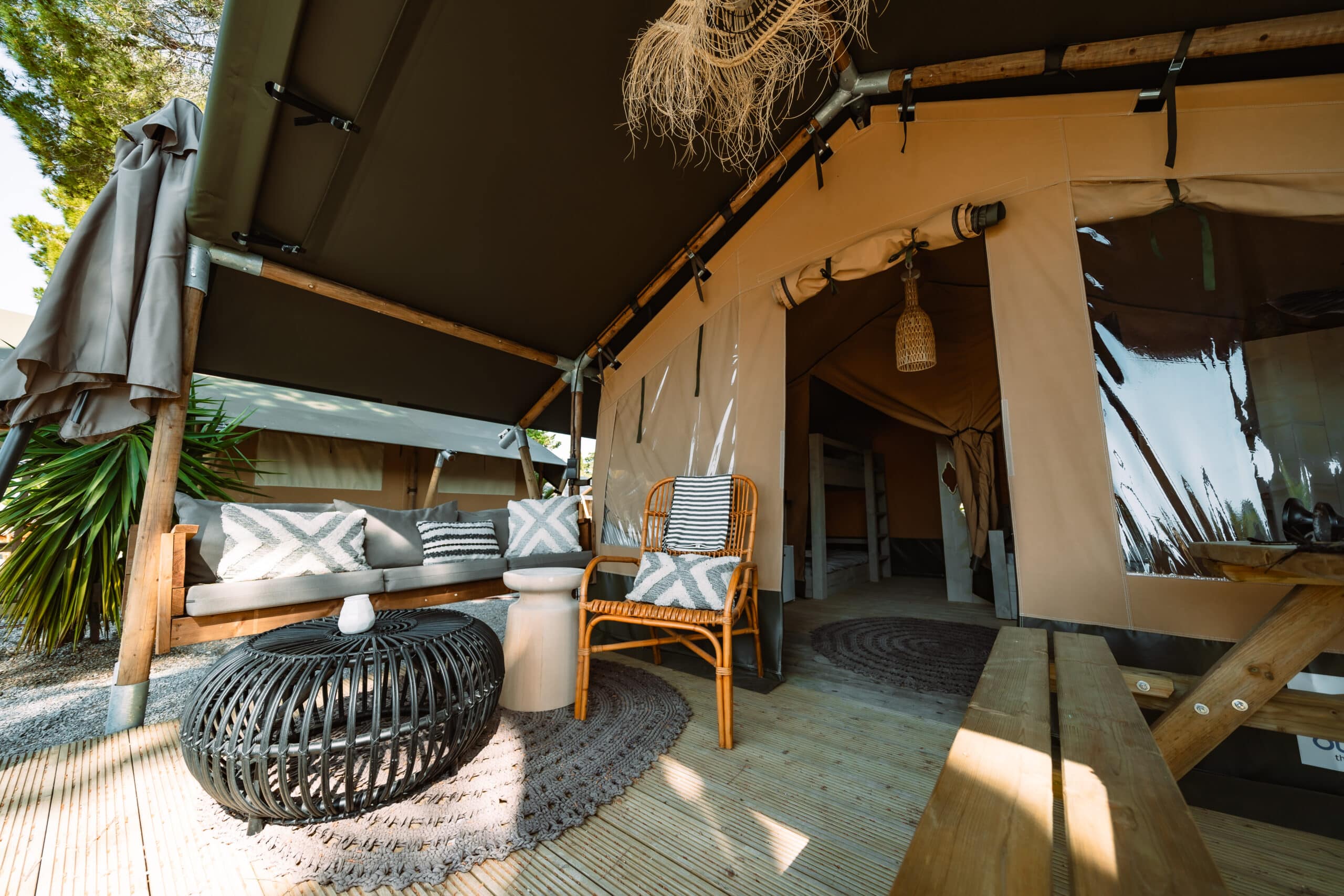 Villa Parade. Safarizelt mit Ibiza-Atmosphäre für 4 Personen. Eigene Terrasse. Eigene Dusche und Toilette.